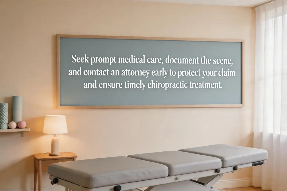 After a crash, seek medical care as soon as possible—delays can mask injuries and weaken a claim. Within the first 48‑72 hours, have a qualified chiropractor evaluate you; early adjustments can uncover hidden misalignments and reduce inflammation before chronic pain develops. At the scene, photograph vehicle damage, your injuries, and the surrounding area; collect witness names, phone numbers, and the police report. Keep every medical record, prescription, and a daily symptom diary, then promptly notify your own insurer and the at‑fault driver’s insurer to preserve policy benefits. Contact a personal‑injury attorney early; a seasoned lawyer will protect your rights, guide documentation, and help maximize settlement value.