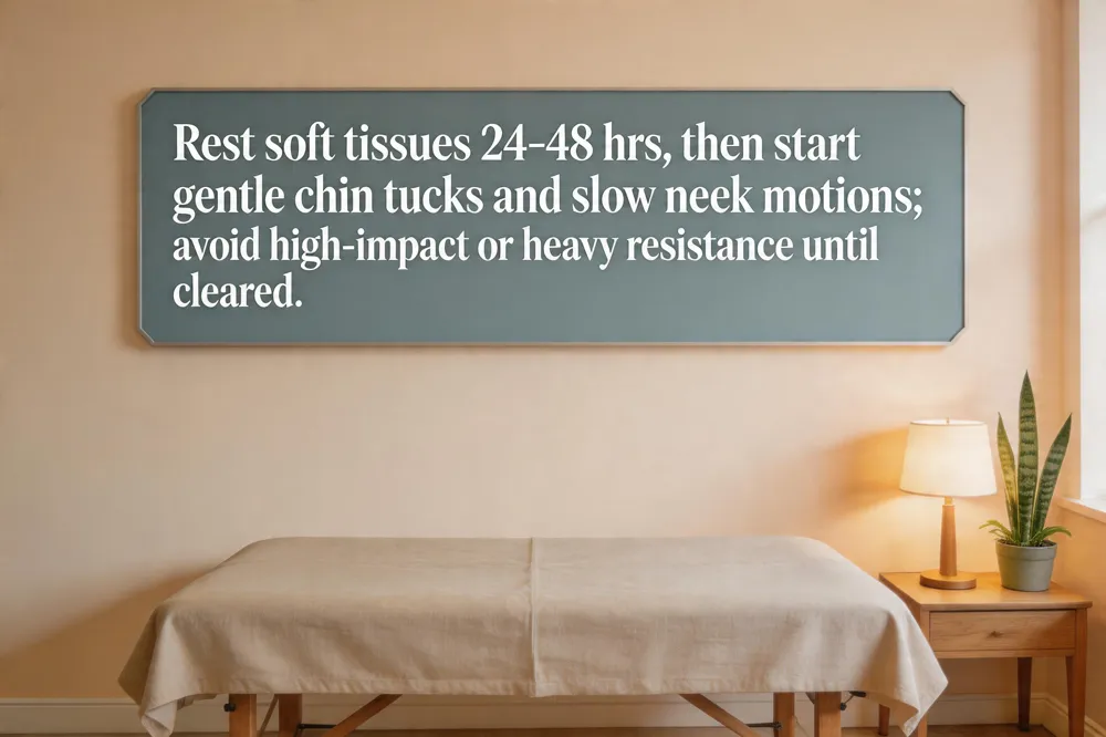 After a whiplash injury, give the soft tissues 24–48 hours of rest before any vigorous activity. Begin gentle, pain‑free movements such as chin tucks, slow neck rotations, and lateral tilts within the first two days, progressing to low‑impact cardio like walking or stationary cycling once neck motion improves. Avoid high‑impact neck rotations, rapid head‑throwing, deep cervical extensions, heavy resistance work (e.g., chin‑tuck bands, overhead presses, deadlifts) and any jarring aerobic exercises such as running or jumping during the acute phase. Contact sports and self‑cracking of the neck should also be postponed. Return to a regular workout routine only after you can move the neck through its full range without pain, typically 1–2 weeks, and after clearance from a chiropractor. Gradually reintroduce core strengthening, light resistance training, and controlled sport‑specific drills, always monitoring symptoms. A personalized plan from Dr. Allison Ross ensures safe progression and minimizes the risk of re‑injury and overall wellbeing for long‑term health and function.
