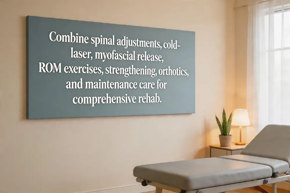 A comprehensive whiplash rehab protocol begins with a thorough assessment and gentle, pain‑free spinal adjustments to re‑align the cervical spine. Dr. Allison Ross then adds low‑level cold laser therapy and myofascial release to decrease inflammation and relax tight muscles. Early range‑of‑motion work—chin tucks, slow neck tilts, and controlled rotations—maintains mobility without aggravating symptoms. As pain subsides, progressive core‑stability drills and strengthening exercises are introduced, complemented by custom orthotics that correct gait and support proper posture. Spinal decompression is employed when disc irritation is present, creating negative pressure that promotes disc re‑hydration and nerve relief. Maintenance care, ergonomic education, and a home‑exercise program complete the plan, helping prevent recurrence.