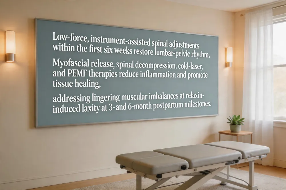 Gentle spinal adjustments are the cornerstone of postpartum care. Within the first six weeks, low‑force, instrument‑assisted techniques realign lumbar vertebrae and the sacroiliac joint, reducing nerve irritation and restoring the natural lumbar‑pelvic rhythm. Myofascial release follows the adjustment, loosening tight thoracic and lumbar fascia that has become stiff from prolonged nursing positions and infant‑care motions. Spinal decompression gently stretches the vertebral column, relieving disc pressure that can linger after the pregnancy‑induced shift in the center of gravity. Cold‑laser and PEMF (Pulsed Electromagnetic Field) therapies complement the manual work by decreasing inflammation, accelerating tissue healing, and supporting nervous‑system signaling without drugs or surgery.