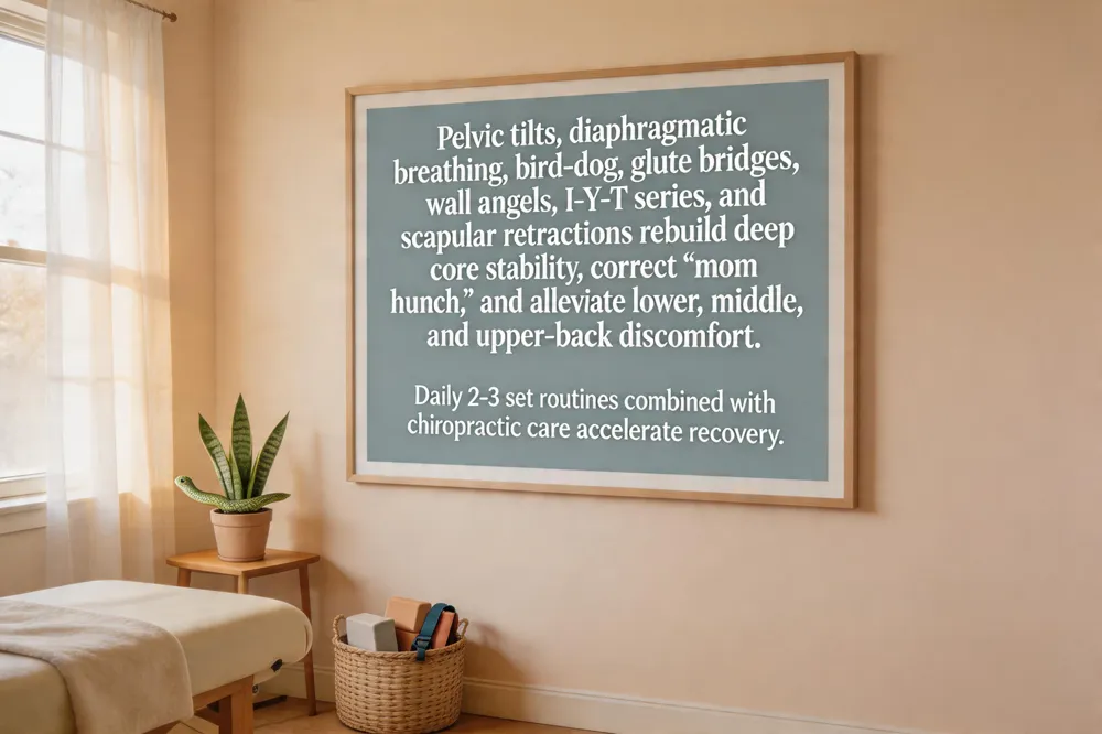 Fixing mom hunch – Combine gentle chiropractic adjustments with chest‑opening moves such as wall angels, scapular retractions, and overhead reaches. Daily habits—using a nursing pillow, keeping weight centered, and performing shoulder rolls—reinforce a stacked rib‑cage‑pelvis position, relieving neck and shoulder discomfort.