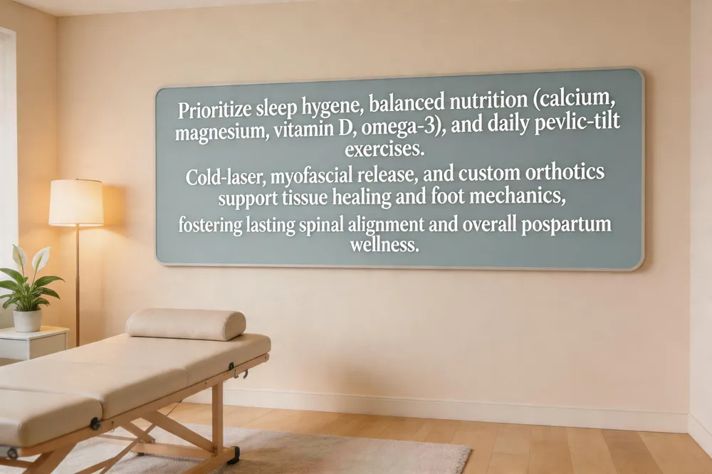Postpartum recovery thrives on good sleep hygiene and nutrition; a pillow between the knees while sleeping keeps the pelvis neutral and a diet rich in calcium, magnesium, vitamin D and omega‑3 supports bone health and reduces inflammation. For lingering aches, cold‑laser therapy and myofascial release relax tight thoracic‑lumbar fascia, decrease swelling, and promote tissue healing without drugs. Realignment can begin at home with a simple pelvic‑tilt: lie on your back, knees bent, pull the belly button toward the spine, flatten the lower back, hold 6 seconds, and repeat 8‑12 times daily; combine this with gentle chiropractic adjustments to restore lumbar‑pelvic rhythm. Custom orthotics correct foot pronation, stabilizing the kinetic chain and easing pelvic‑tilt strain.