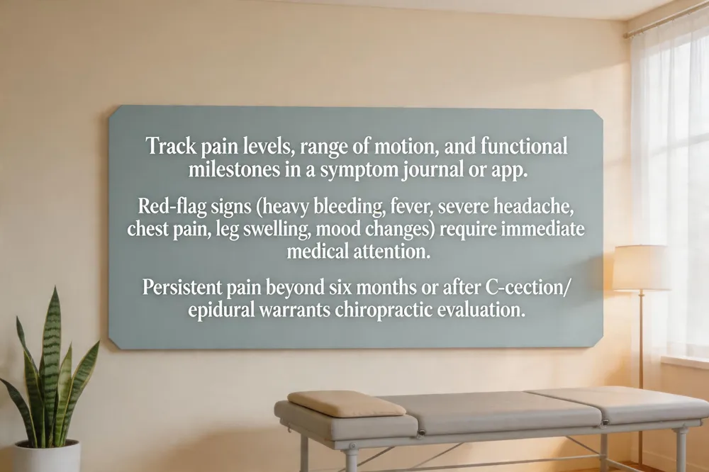 Keeping a symptom journal or using a digital tracking app lets new mothers record pain levels, range of motion, and functional milestones. trends that reveal worsening pain or new symptoms can be flagged early. Red‑flag signs that require immediate medical attention include heavy bleeding or large clots, fever, foul‑smelling discharge, severe abdominal cramping, persistent headaches, chest pain, shortness of breath, leg swelling, sudden mood changes, or thoughts of self‑harm. Early postpartum sepsis may present with fever, severe localized pain, muscle soreness, reduced urine output, rapid heart rate, and chills. C‑section‑specific considerations involve scar tissue, weakened core, and lingering hormonal laxity; persistent lower‑back pain three or six months after a C‑section often benefits from gentle spinal adjustments, myofascial release, cold‑laser therapy, and supportive core activation. Epidural‑related back pain usually improves within days, but if it lasts beyond a few weeks (or five months), targeted chiropractic care can restore alignment and reduce inflammation. In general, it is safe and effective to see a chiropractor after birth—especially when pain is moderate, posture is poor, or daily activities are limited. Consult a chiropractor promptly if pain persists beyond six months, worsens, or is accompanied by any red‑flag symptoms, to prevent chronic issues and support a healthy recovery.