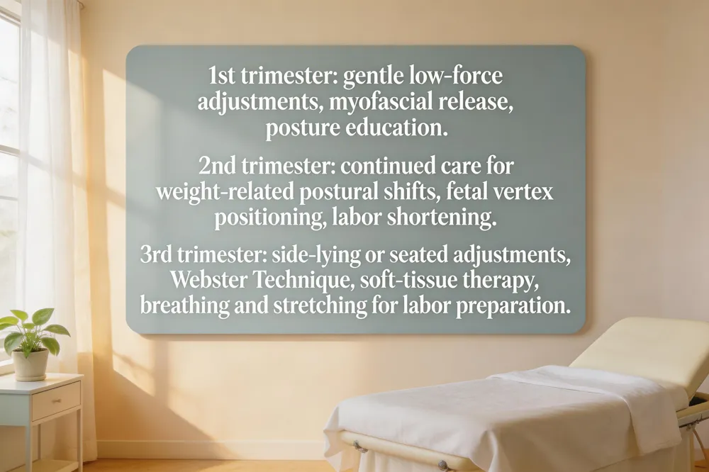 In the third trimester, comfort is paramount. Adjustments are performed in side‑lying or seated positions, often using the Webster Technique to relax the sacrum and round ligaments. Soft‑tissue therapies, myofascial release, and cold‑laser treatment reduce tension and improve circulation. Personalized stretching and breathing exercises prepare the pelvis for labor, supporting a smoother, less‑intervention delivery.