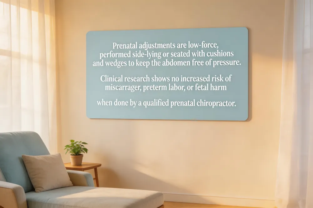 Extensive research shows No evidence that chiropractic care causes miscarriage between prenatal chiropractic adjustments and miscarriage or preterm labor. Large retrospective reviews and systematic analyses report adverse of such events when treatments are performed by chiropractors with specialized prenatal training. These practitioners use gentle, low‑force techniques—often side‑lying on padded tables, instrument‑assisted (Activator) impulses, or the Webster Technique—to avoid any direct pressure on the abdomen and to respect the increased ligament laxity of pregnancy. Because the uterus is not the target of the adjustment, the risk of uterine stimulation is negligible.