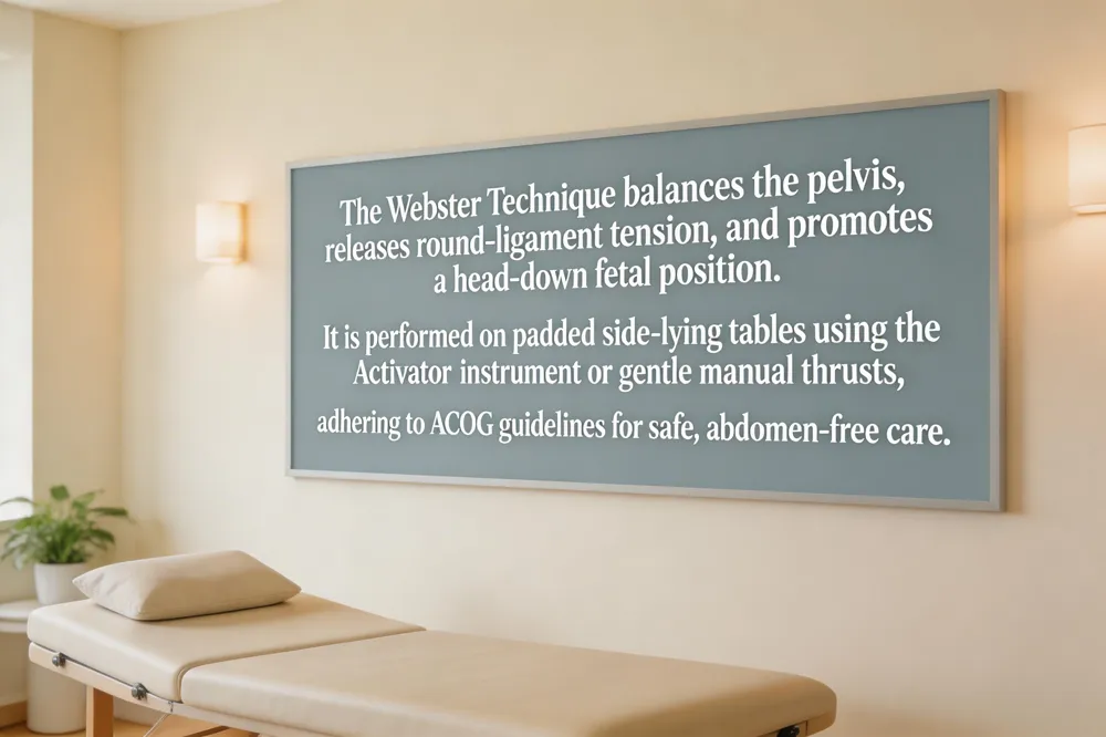 The Webster Technique is a gentle, pregnancy‑specific chiropractic adjustment that balances the pelvis, eases sacral subluxations, and releases tension in the round ligaments. By creating more intra‑uterine space, it helps relieve lower‑back pain, sciatica, and pelvic discomfort while encouraging the baby to assume a head‑down (vertex) position, which can contribute to a smoother labor. Dr. Allison Ross, DC, is certified in the Webster Method and performs it on a padded, side‑lying table to protect the abdomen.