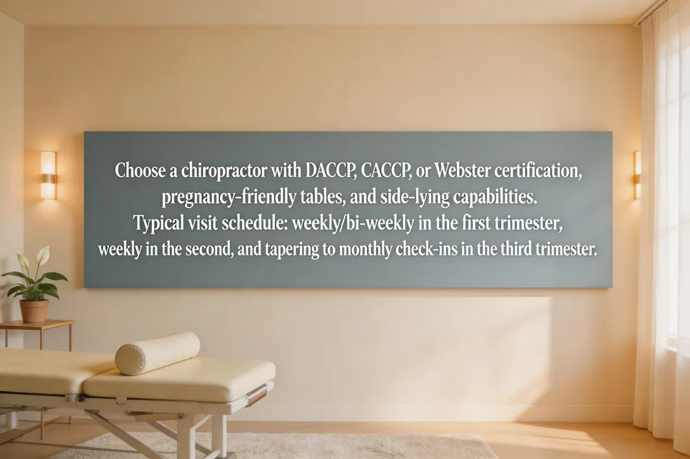 When selecting a prenatal chiropractor, look for credentials such as DACCP, CACCP, or Webster certification, which signal specialized training in pregnancy‑specific biomechanics. The office should feature pregnancy‑friendly equipment—adjustable tables, bolsters, and side‑lying positions—to avoid abdominal pressure and ensure comfort. Visit frequency is individualized: many women begin with weekly or bi‑weekly sessions in the first trimester, continue weekly in the second, and maintain weekly or bi‑weekly care in the third trimester, while occasional month‑to‑month check‑ins may suffice once alignment is established.