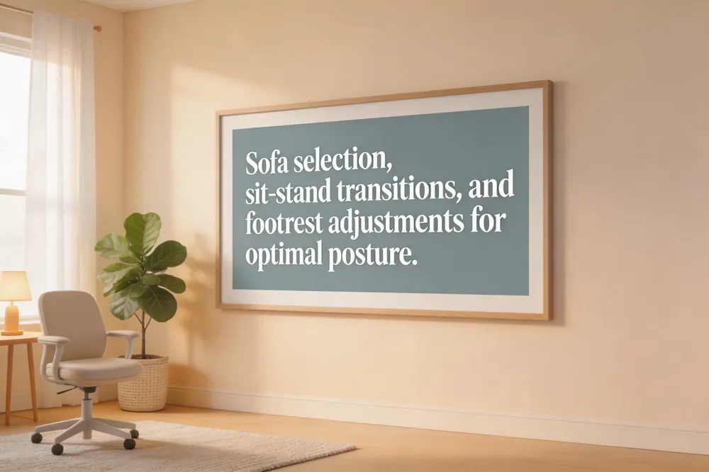 Footrest and seat‑depth adjustments – Ensure footrest or on a footstool, knees at 90°, and seat depth that lets you slide a hand under the thigh. Adjust lumbar support to maintain a slight inward curve.