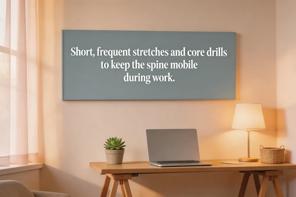Simple workstation stretches: doorway chest opener, seated figure‑four stretch, neck rolls, and wrist extensions. Keep the monitor at eye level, elbows at a 90‑degree angle, and feet flat on the floor with lumbar support.