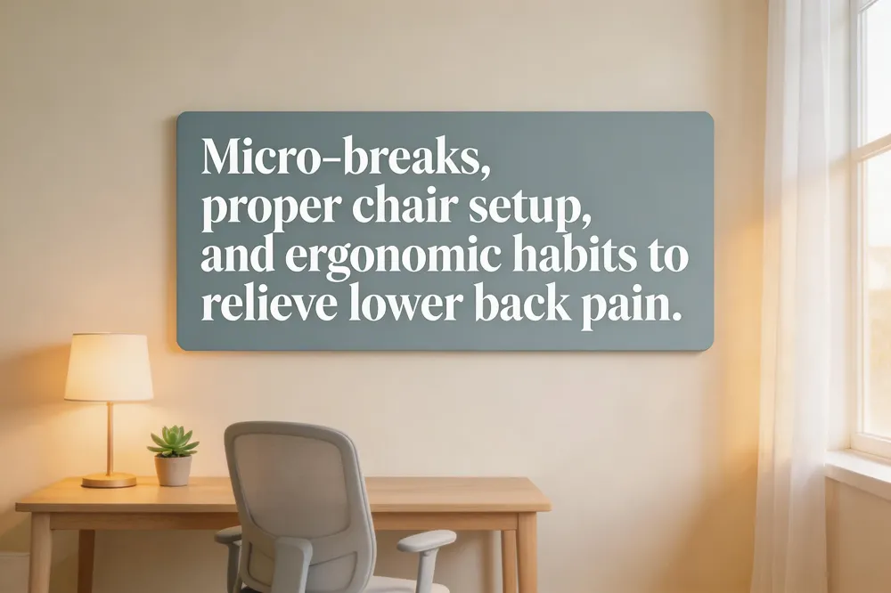 How to relieve lower back pain at work? Take micro‑breaks every 20‑30 minutes to stand, walk, and perform gentle stretches such as knee‑to‑chest or seated cat‑cow, keeping the lumbar spine mobile. Adjust chair height, use a lumbar roll, and ensure feet are flat. If pain persists, see a chiropractor for personalized adjustments.