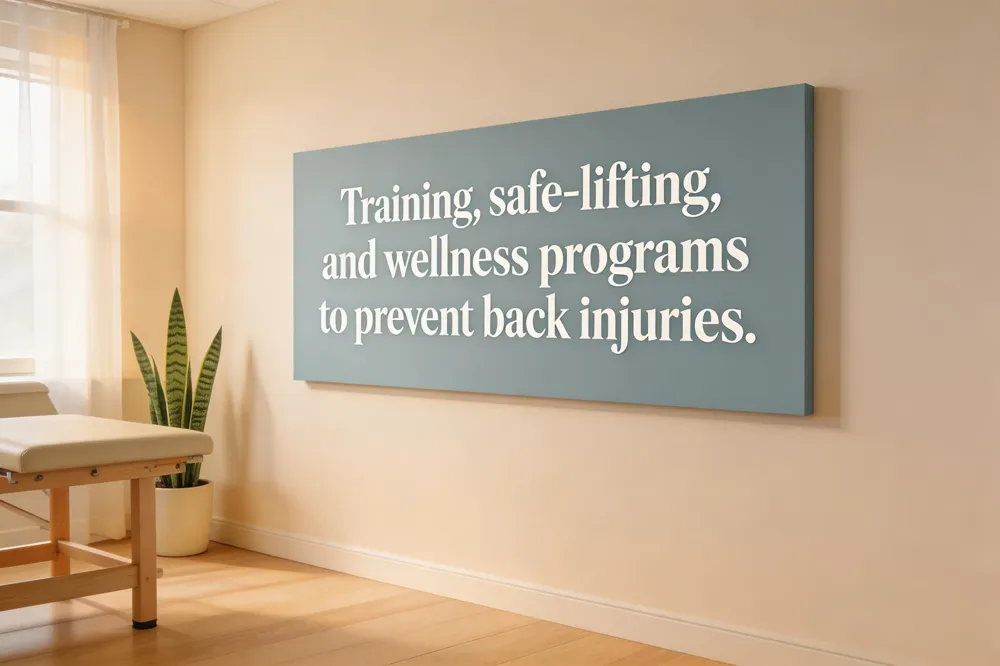 What can an employer do to prevent back injuries? Conduct ergonomic assessments, provide adjustable chairs and workstations, schedule regular movement‑break reminders, and offer safe‑lifting training and mechanical aids. Wellness programs that include access to chiropractic or physical‑therapy services, core‑strengthening exercise classes, and stress‑management resources further support long‑term spinal health.