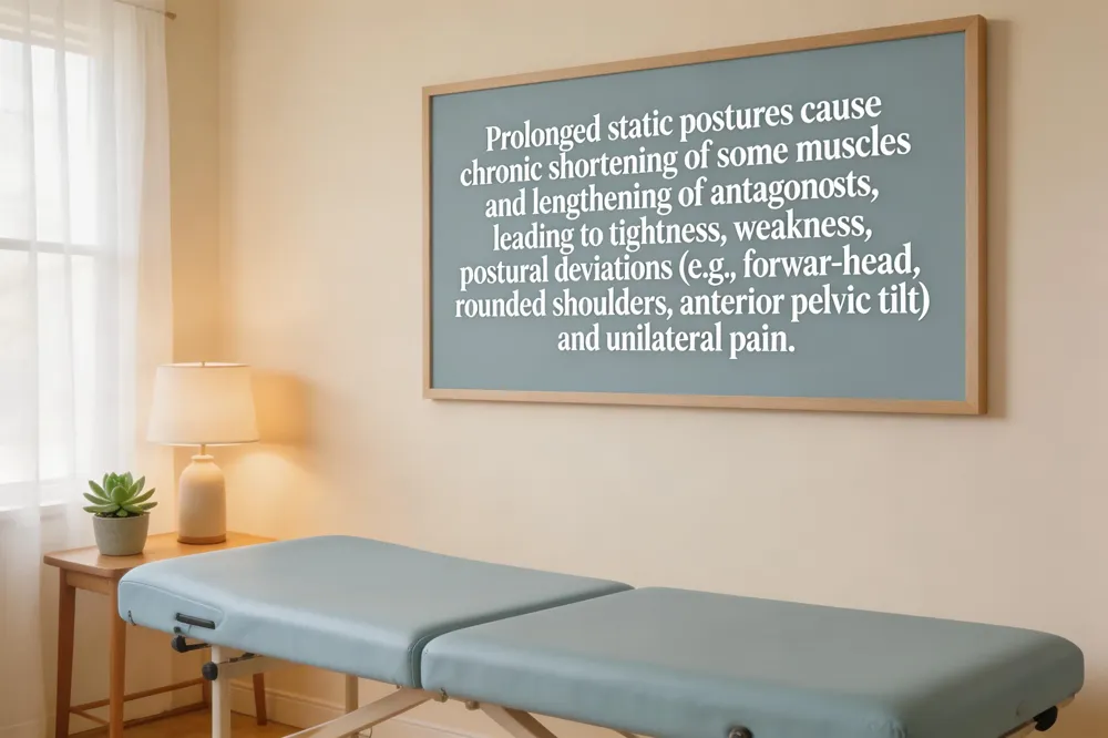 Ergonomic and lifestyle adjustments – Set up workstations with neutral monitor height, alternate the shoulder used to carry a bag, and take micro‑breaks every 30–60 minutes. Incorporate corrective exercises (single‑leg bridges, scapular rows) and myofascial release to address emerging imbalances.