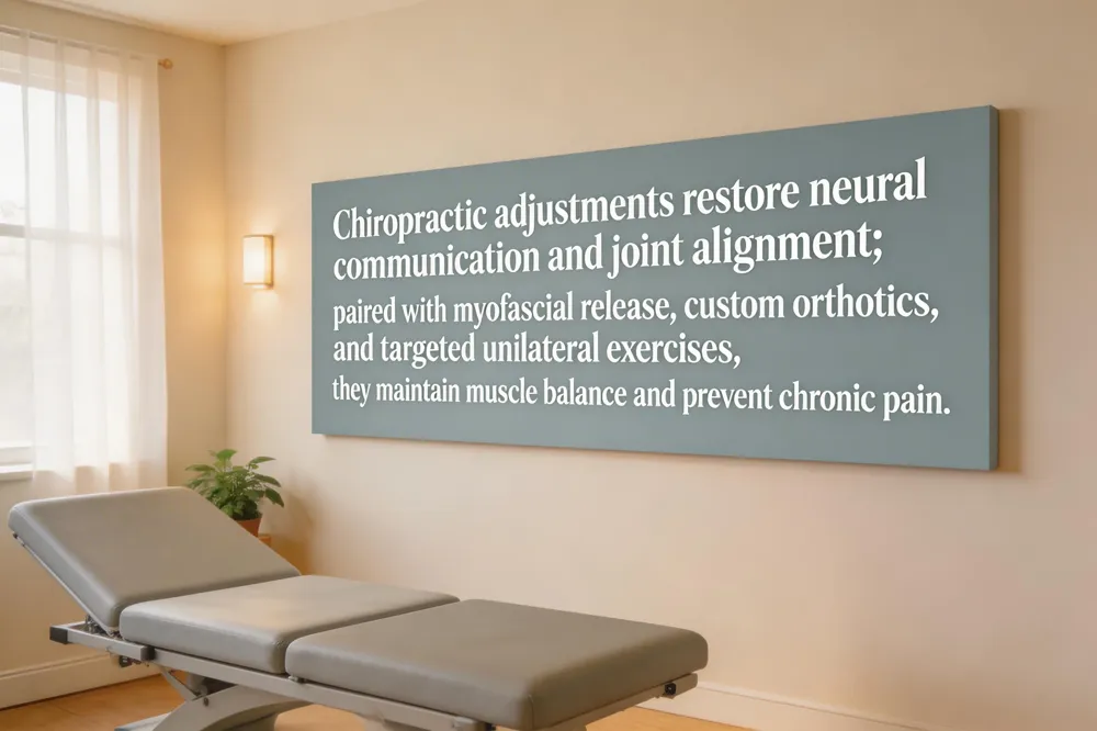 Chiropractic adjustments improve neural communication by restoring proper spinal and joint alignment, allowing the nervous system to send balanced activation signals to muscles. This correction reduces compensatory over‑activity and under‑use that create muscle imbalances. Adjunct therapies such as myofascial release, cold‑laser therapy, and custom orthotics complement adjustments: myofascial release tightaments tight, structural scar improving imaging supports tissues, and orthotics correct foot and lower‑extremity mechanics that can cascade upward to the knees, hips, and lumbar spine. Personalized rehabilitation timelines begin with a functional assessment—often using single‑leg squats, gait analysis, and posture screens—to pinpoint weak, over‑active, and tight muscles. The plan then combines targeted unilateral strengthening, stretching of shortened tissues, and ongoing chiropractic care to maintain balance.