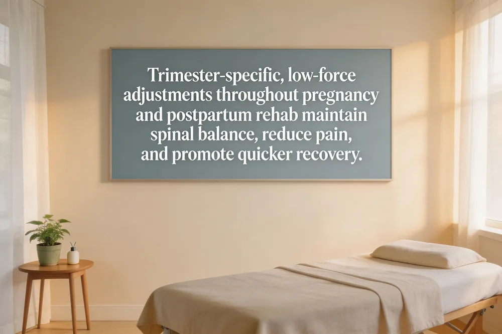 First‑trimester adjustments are safe when the chiropractor is prenatal‑trained. Gentle, low‑force spinal work relieves early postural shifts, nausea‑related tension and low‑back pain, using a padded table that avoids abdominal pressure.