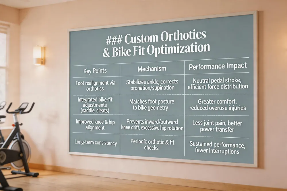 | Foot realignment via orthotics | Stabilizes ankle, corrects pronation/supination | Neutral pedal stroke, efficient force distribution |