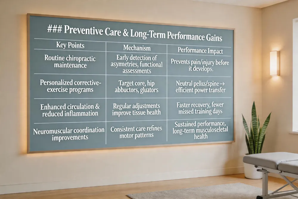 | Routine chiropractic maintenance | Early detection of asymmetries, functional assessments | Prevents pain/injury before it develops |