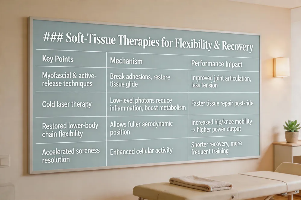 Myofascial release and active‑release techniques target the tight hip flexors, hamstrings and quadriceps that riders develop from prolonged forward‑leaning posture and repetitive pedaling. By breaking down adhesions and restoring normal tissue glide, these therapies relieve muscular tension, improve joint articulation, and re‑establish a balanced range of motion. Cold laser therapy complements soft‑tissue work by delivering low‑level photons that reduce localized inflammation, stimulate cellular metabolism, and accelerate tissue repair after intense rides or micro‑trauma. When flexibility in the lower‑body chain is restored, cyclists can achieve a fuller, more aerodynamic position without compromising comfort, allowing a smoother, longer pedal stroke. The resulting increase in hip and knee mobility translates directly into higher power output, while the faster resolution of muscle soreness shortens post‑ride recovery, enabling more frequent and higher‑quality training sessions.