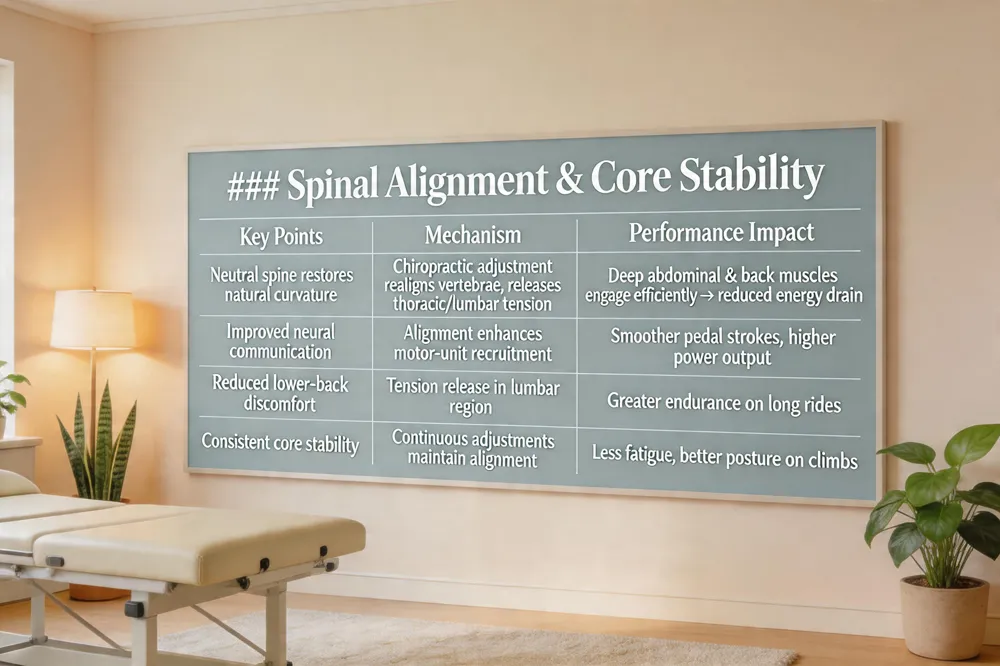 Cyclists spend hours in a forward‑leaning position, which can compromise the natural curvature of the spine and force the core to work harder to stay stable. Chiropractic adjustments restore a neutral spine by realigning vertebrae and releasing tension in the thoracic and lumbar regions. This alignment allows the deep abdominal and back muscles to engage efficiently, reducing the energy drain that leads to early fatigue on long rides. Research cited in multiple sports‑medicine articles shows that a properly aligned spine improves neural communication, enhancing motor unit recruitment and power output. Riders who receive regular spinal adjustments report smoother pedal strokes, less lower‑back discomfort, and a noticeable increase in endurance, confirming the link between spinal health, core stability, and cycling performance.