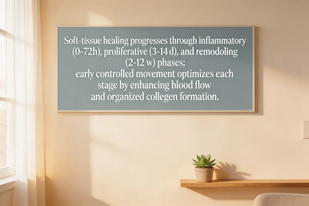Soft‑tissue injuries heal in three overlapping phases. The inflammatory phase (0‑72 hours) brings blood, oxygen, and nutrients to the damaged site, initiating the cascade that removes debris and sets the stage for repair. Within the proliferative/repair phase (3‑14 days), fibroblasts become active, laying down new collagen fibers and forming granulation tissue that restores basic structural integrity. As the remodeling phase (2‑12 weeks) unfolds, collagen fibers realign, cross‑link, and mature, increasing tensile strength and allowing the tissue to tolerate higher loads. Early controlled movement—gentle range‑of‑motion exercises and low‑impact activity—stimulates blood flow, prevents excessive scar‑t formation, and signals fibroblasts to produce organized collagen, thereby optimizing each phase. By avoiding prolonged immobilization and introducing progressive loading at the appropriate time, athletes can accelerate nutrient delivery, enhance cellular metabolism, and achieve stronger, more resilient tissue before returning to full sport participation.