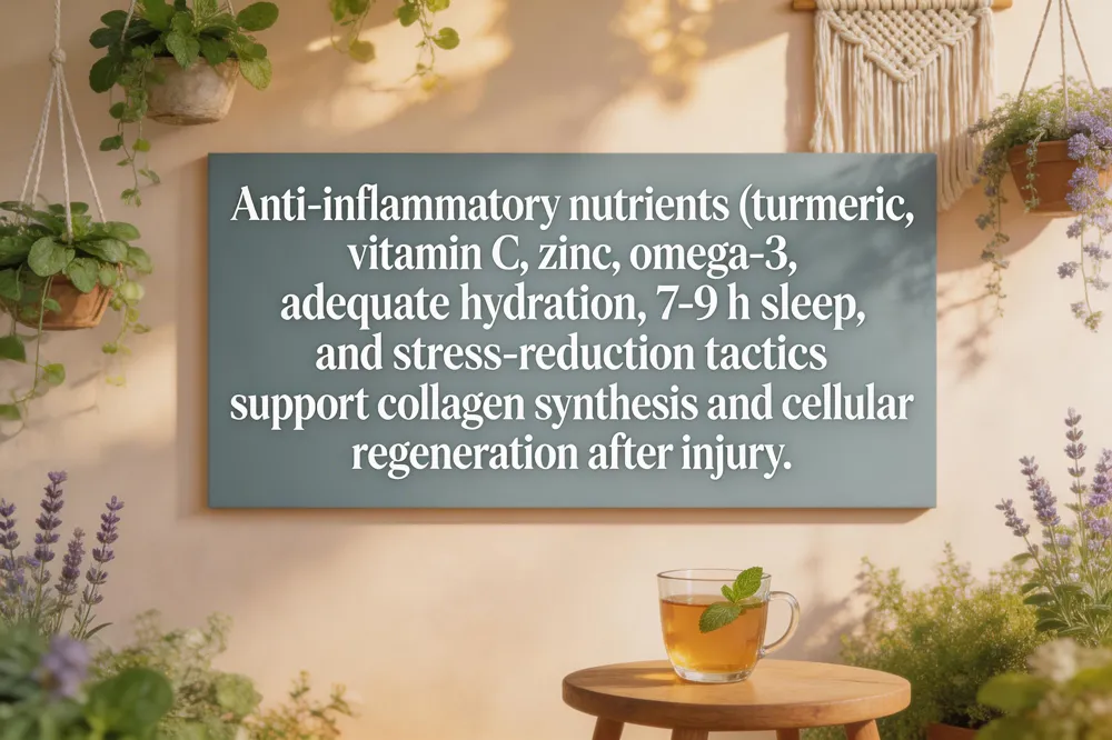 Turmeric (Curcuma longa) delivers curcumin, a potent anti‑inflammatory herb that dampens the acute inflammatory surge after a muscle tear, reduces oxidative stress, and supports collagen synthesis for faster muscle fiber rebuilding. Pair turmeric with protein‑rich foods (lean meats, beans, dairy), vitamin C (citrus, berries), zinc (pumpseed seeds, oysters), and omega‑3 fatty acids (fatty fish, flaxseed) to supply the amino acids and micronutrients essential for tissue repair. Hydration strategies—drinking 2‑3 L of water daily, adding electrolyte drinks during heavy training—maintain plasma volume and nutrient transport to the injured site. Aim for 7‑9 hours of quality sleep each night; growth hormone peaks during deep sleep, driving collagen production and cellular regeneration. Stress‑reduction techniques such as mindfulness meditation and diaphragmatic breathing lower cortisol, which otherwise hinders healing. Immediately after injury, avoid heat (hot packs, saunas), alcohol, high‑impact activity, and deep‑tissue massage, as each can increase swelling, bleeding, or further tissue damage.