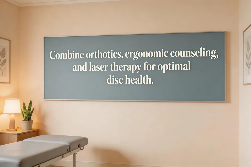 A comprehensive conservative program focuses on preventing recurrence and supporting permanent relief. Core‑strengthening and corrective exercises improve spinal stability, while custom orthotics and ergonomic counseling correct posture and loading patterns. Weight management reduces axial stress on the discs, and regular activity modification (avoiding prolonged flexion, heavy lifting, and poor sitting habits) protects the spine. Ongoing maintenance care—periodic chiropractic adjustments, myofascial release, and low‑level laser therapy—keeps tissue tension low and circulation high, allowing the disc to stay re‑hydrated and reducing the chance of new bulges.