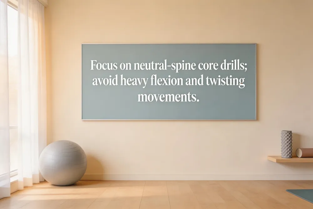 Instead, focus on neutral‑spine core‑strengthening routines. Begin with pelvic tilts, gentle bird‑dog drills, and controlled press‑up back extensions that engage the transverse abdominis and multifidus without loading the disc. Low‑impact spinal‑mobility stretches such as the cat‑cow, cobra pose, and supine hamstring stretches improve flexibility while keeping the lumbar region relaxed. Gradual progression to bridges, Pilates‑style core work, and light lumbar extensions is appropriate as pain diminishes.