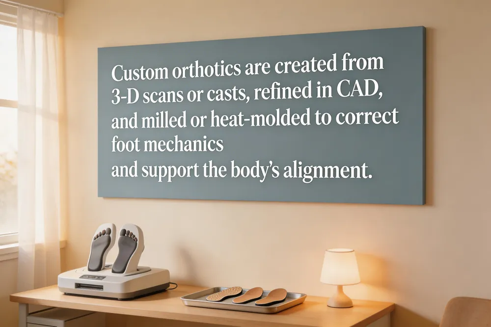 Design begins with a comprehensive foot assessment—symptom review, gait analysis, and precise measurement of arches and pressure points. A 3‑D digital scan or foam/plaster cast captures the exact foot contour, which is imported into CAD software. Clinicians add corrective offsets for over‑pronation, supination, or leg‑length discrepancies. The CAD model is then milled or heat‑molded, and hand‑finished to match the patient’s anatomy.