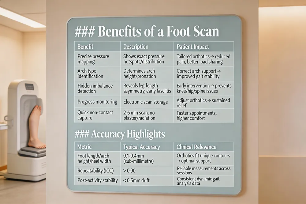 Digital foot scanning delivers a suite of tangible benefits that set the stage for truly personalized orthotic therapy. Scans are completed in seconds, capture the foot’s exact contours with sub‑millimetre accuracy (often within 0.1‑0.4 mm), and eliminate the mess, waste, and time required for plaster casts. The data is instantly emailed to the lab, enabling rapid design, CAD/CAM fabrication, and delivery of a custom insole within days rather than weeks. Because the model is stored electronically, clinicians can track changes over time and adjust the orthotic as the patient’s gait evolves.