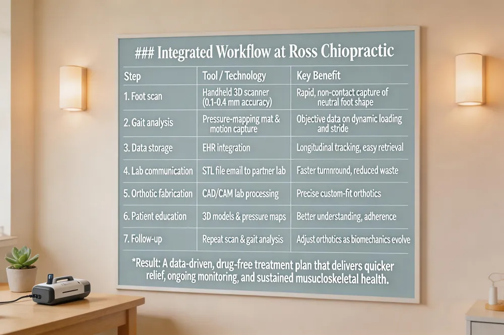Ross Chiropractic’s drug‑free, holistic philosophy places the foot at the center of the kinetic chain, recognizing that misaligned arches can cascade into knee, hip, and spinal pain. By employing a handheld 3D foot scanner that captures a neutral, non‑weight‑bearing foot model within seconds, the clinic eliminates the mess and discomfort of plaster casts while delivering sub‑millimetre accuracy (0.4 mm to 0.1 mm). The digital scan is instantly uploaded to the clinic’s electronic health‑record system, where it is stored alongside gait‑analysis data from pressure‑mapping mats. This seamless workflow lets clinicians email the 3D model to partner orthotic laboratories across state lines, shortening turnaround time to a few days and reducing material waste. Because the scan and gait reports are archived electronically, Ross Chiropractic can track foot‑shape changes over months or years, adjusting orthotics as a patient’s biomechanics evolve. The visual 3‑D models and pressure‑map graphics also serve as powerful patient‑education tools, helping individuals see exactly how arch height, pronation, or leg‑length asymmetry affect their posture and pain. By integrating precise scanning, objective gait analysis, and custom‑fabricated orthotics into a single, drug‑free treatment plan, Ross Chiropractic delivers faster relief, long‑term monitoring, and a clear, data‑driven path to sustained musculoskeletal health.