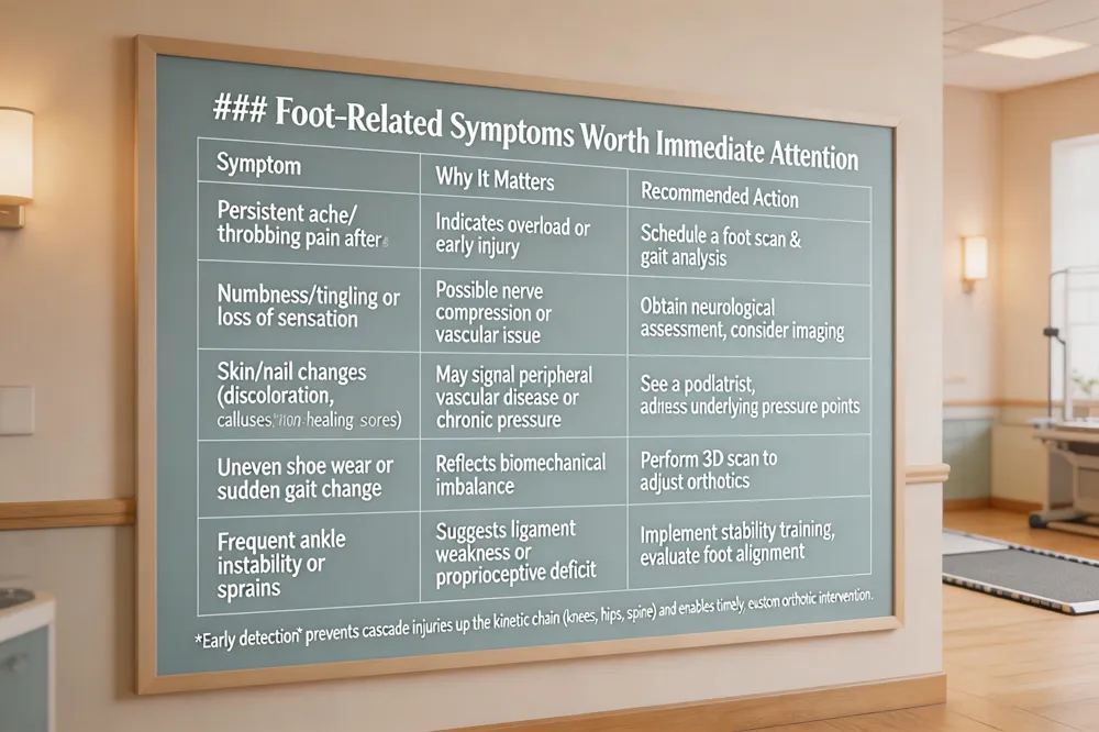 Persistent ache or throbbing pain in the feet or ankles after normal activity should never be ignored. Numbness, tingling, or loss of sensation that comes and goes or stays constant is a warning sign. Visible changes in skin, nails, or hair on the feet—such as discoloration, thickening, calluses, or non‑healing sores—require attention. Uneven wear patterns on shoes or sudden changes in gait suggest misalignment that should be evaluated. Frequent ankle instability, repeated sprains, or a feeling that the ankle gives way are symptoms that must be addressed promptly.