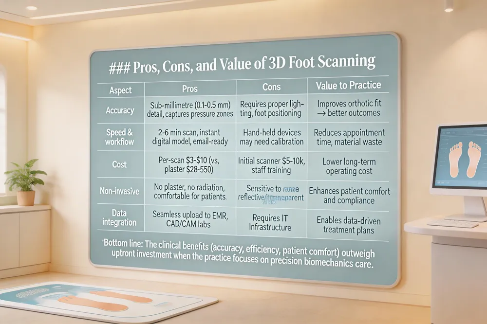 What are the pros and cons of 3D scanning? It delivers ultra‑accurate, non‑invasive foot models that improve orthotic fit, gait‑analysis insight, and patient comfort, but it demands capital investment, trained operators, and careful environmental control.