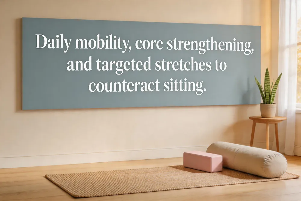 Combine mobility and core work: start with cat‑cow and kneeling back‑extensions, then pelvic tilts, wall angels, and seated spinal rotations. Finish with glute bridges and bird‑dogs. Perform 2‑3 times weekly for 4‑6 weeks, then maintain daily.