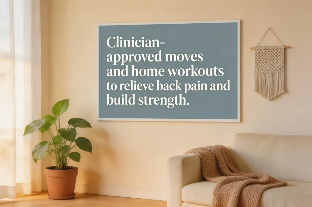 Try these clinician‑approved moves: Cat‑Cow stretch (10‑15 reps), Child’s Pose (30‑45 sec), Knee‑to‑Chest (10 each side), Bird‑Dog (12 each side), Pelvic Tilts (15), Supine Glute Bridge (12), Modified Side Plank (30 sec each side). Begin with stretches, then strengthen; one set daily, progressing as comfort improves.
