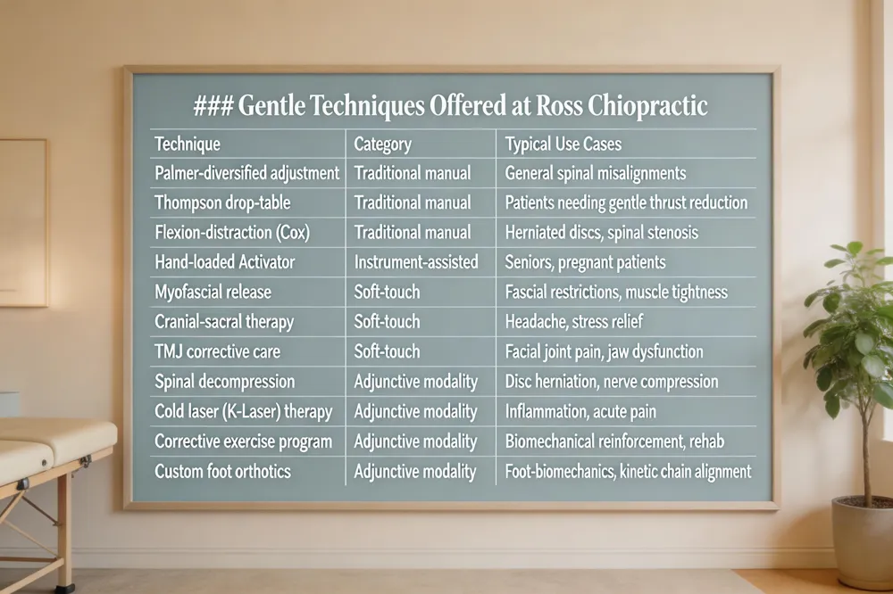 What is the safest chiropractic technique?: The safest approach is a gentle, low‑force method that stays within normal joint motion and minimizes stress on bones, discs, and nerves. Techniques such as low‑force flexion‑distraction, soft‑touch spinal mobilization, and the instrument‑assisted Activator are consistently cited as the most patient‑friendly, especially for osteoporosis, pregnancy, or recent injury. Dr. Ross frequently incorporates these gentle methods to ensure safe, effective care.