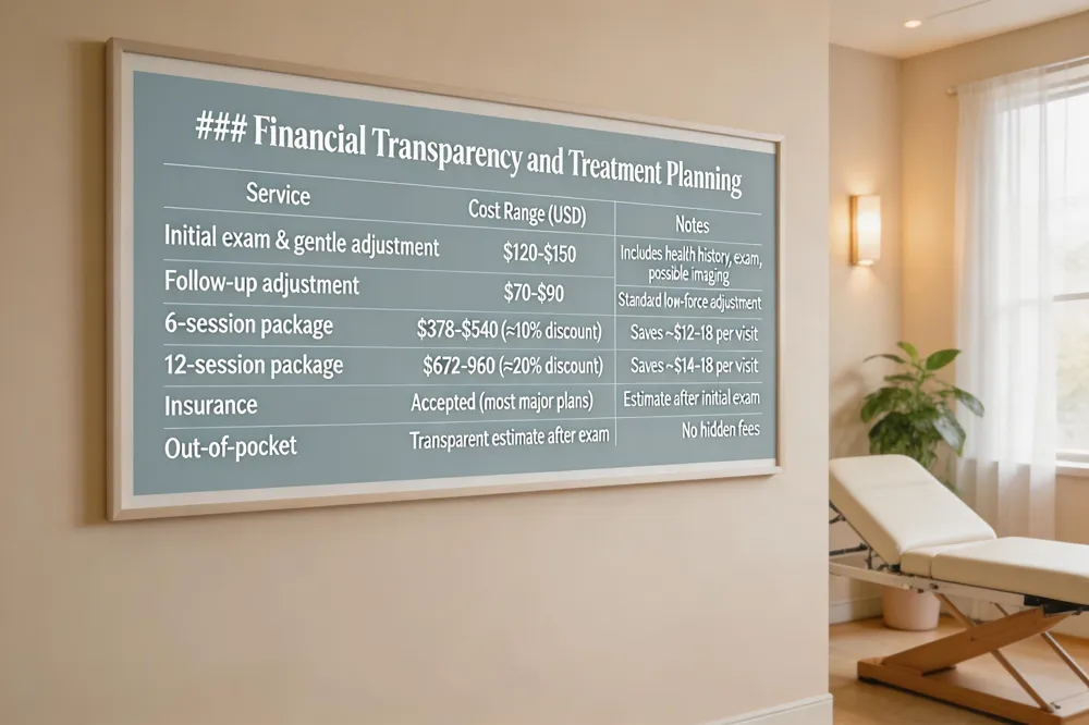 | At Ross Chiropractic the first visit—comprising a health history, physical exam, diagnostic imaging when needed, and an initial gentle adjustment—typically costs between $120 and $150. Regular follow‑up adjustment sessions are priced at $70 to $90 each. To make ongoing care more affordable, the clinic offers multi‑visit packages; a six‑session bundle can reduce the per‑visit fee by roughly 10 percent and a twelve‑session package can bring savings up to 20 percent. Most major insurance plans are accepted, and after the initial exam the office provides a clear estimate of any remaining out‑of‑pocket costs, ensuring patients know exactly what they will owe. This transparent pricing model balances affordable individual appointments with discounted packages, while insurance coverage and clear out‑of‑pocket expectations help patients plan their care without surprise expenses. |