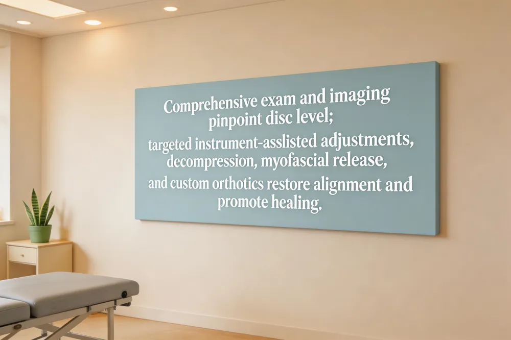 A chiropractor begins with a thorough physical exam and palpation, assessing spinal mobility, tissue tenderness, reflexes and muscle strength to locate functional signs of a herniated disc. While the disc itself cannot be felt, these findings often point to a specific level such as L4‑L5 or L5‑S1. When the clinical picture is unclear, imaging (X‑ray, MRI, CT) is ordered to confirm the herniation. For a disc‑L4‑L5 herniation, gentle instrument‑assisted adjustments and targeted decompression reduce pressure on the bulging disc and the sciatic nerve, while myofascial release, cold‑laser therapy, corrective exercises, and custom orthotics restore alignment and promote re‑hydration. The same multimodal approach applies to L5‑S1, with precise adjustments relieving S1 nerve‑root irritation and spinal decompression encouraging disc healing. Patients typically notice improvement after 4–6 weeks of 2–3 weekly visits, though severity and adherence affect the timeline. Chiropractic care complements physical therapy by providing rapid pain relief through adjustments and decompression, while PT focuses on long‑term core strengthening and posture. Evidence shows that when performed by a qualified, patient‑focused practitioner—such as Dr. Allison Ross—chiropractic interventions can safely alleviate herniated disc symptoms without worsening the condition, though overly aggressive adjustments must be avoided.