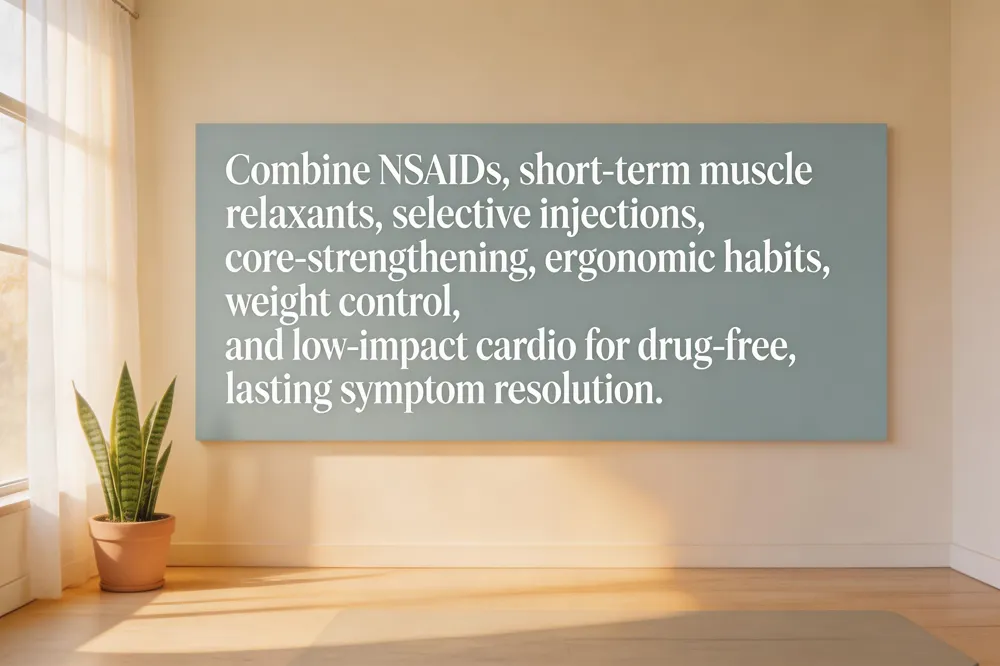 Non‑surgical treatment of herniated discs focuses on reducing inflammation, relieving nerve pressure, and supporting the disc’s natural healing ability. First‑line medication includes NSAIDs (ibuprofen, naproxen) and short‑term muscle relaxants to control pain and spasm, while selective nerve root or epidural steroid injections can provide targeted anti‑inflammatory relief when symptoms persist. Adjunct modalities such as spinal decompression, myofascial release, cold‑laser therapy, and corrective core‑stabilization exercises improve disc hydration, reduce mechanical load, and restore proper alignment. Lifestyle changes are essential: maintain a healthy weight, avoid prolonged slouched sitting, limit forward‑bending or heavy‑lifting activities, and incorporate regular low‑impact aerobic activity (walking, stationary bike). Gentle stretching, core‑strengthening moves (plank, dead‑bug, bird‑dog) and ergonomic education further protect the L4‑L5 disc. Most patients achieve full symptom resolution within six to eight weeks without surgery, though recovery speed varies. Rare side effects of spinal decompression include mild soreness or transient pain spikes, which resolve quickly. A structured, drug‑free program—combining medication, targeted injections, manual therapies, exercise, and ergonomic habits—can often cure a slipped disc and prevent recurrence.