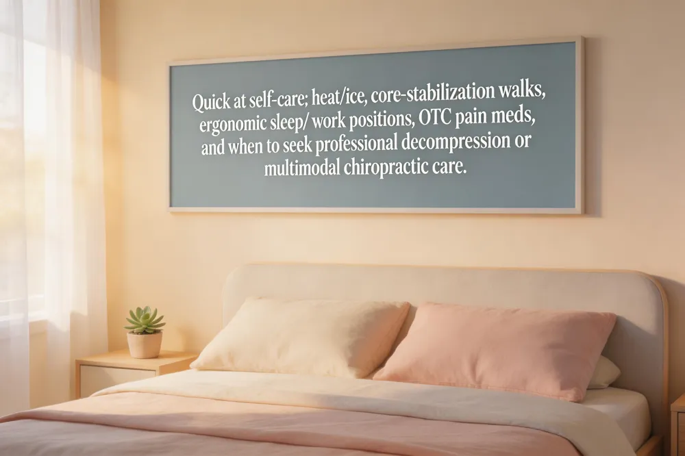 Heat and ice therapy are cornerstone home measures: a low‑heat pad for 15‑20 minutes before activity relaxes muscles, while an ice pack wrapped in a thin towel for 10‑15 minutes every few hours reduces inflammation. [Core stabilization](https://pmc.ncbi.nlm.nih.gov/articles/PMC10211408/) keep the spine mobile—short, level walks every 2‑3 hours and simple exercises such as pelvic tilts, cat‑cow stretches, and bird‑dog poses support the disc and lessen nerve pressure. Sleep positioning and ergonomics matter; a firm mattress with a pillow under the knees when lying on the back, or a pillow between the knees when side‑lying, maintains a neutral spine, and an ergonomic chair with lumbar support reduces prolonged slouching. Over‑the‑counter pain relief includes [NSAIDs (ibuprofen, naproxen)](https://www.mayoclinic.org/diseases-conditions/herniated-disk/diagnosis-treatment/drc-20354101) or acetaminophen for mild pain; muscle relaxants may help spasms, and gabapentin/pregabalin address nerve pain when prescribed. Seek professional care if pain persists beyond a few weeks, worsens, or is accompanied by numbness, weakness, or bladder/bowel changes—then a supervised [spinal‑decompression program](https://my.clevelandclinic.org/health/treatments/10874-spinal-decompression-therapy), [corrective exercises](https://pmc.ncbi.nlm.nih.gov/articles/PMC10211408/), or a [chiropractor’s multimodal plan](https://pmc.ncbi.nlm.nih.gov/articles/PMC12040341/) can provide safe, drug‑free healing.