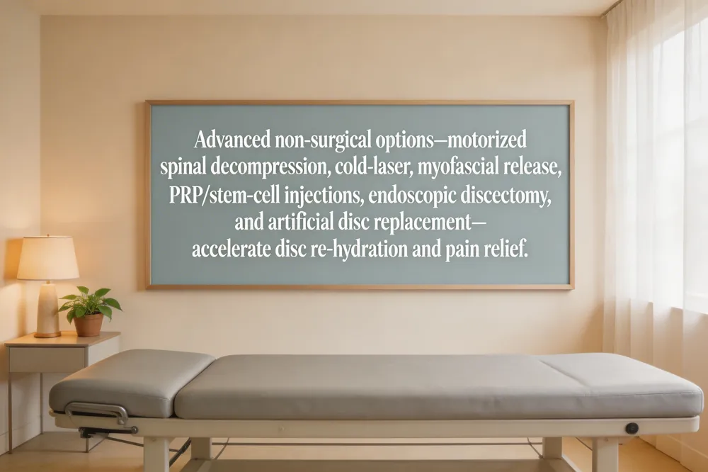 Spinal decompression therapy uses a motorized traction table to create negative pressure inside intervertebral discs, encouraging re‑hydration and re‑traction of herniated material. Modern units such as the DRX9000® allow clinicians to target specific levels while monitoring disc loads. Myofascial release and low‑level cold laser therapy reduce muscular tension and inflammation, improving circulation and accelerating cellular repair. Regenerative injections—platelet‑rich plasma (PRP) and autologous mesenchymal stem cells—deliver growth factors that promote extracellular‑matrix production and disc hydration, offering a biologic alternative to surgery. Ultra‑minimally invasive endoscopic discectomy removes disc fragments through sub‑centimeter incisions, resulting in minimal blood loss, same postoperative pain, and rapid return to activity. Artificial disc replacement preserves segmental motion and lowers rates of adjacent‑segment degeneration compared with fusion. Together, these evidence‑based, non‑surgical options provide a comprehensive, drug‑free pathway for patients with discogenic pain, herniated discs, sciatica, and degenerative disc disease, reducing reliance on medication and invasive surgery.