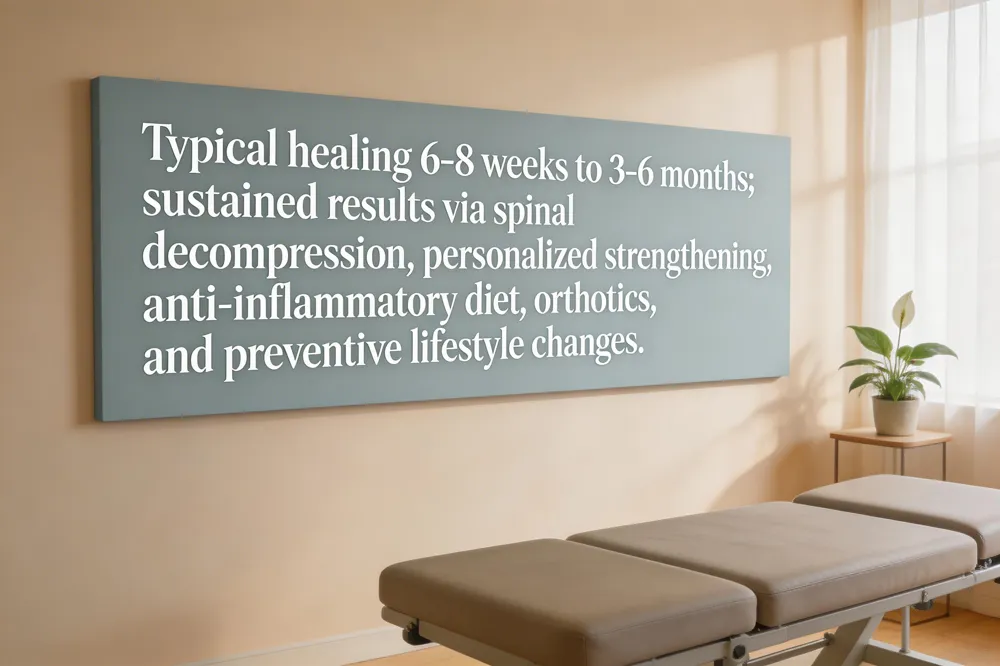 Typical healing timelines for a herniated disc range from a few weeks of symptom relief to three to six months for full functional recovery, depending on severity and adherence to therapy. Recovery speed is influenced by age, disc health, activity level, body mechanics, and early initiation of non‑invasive care. Preventive lifestyle changes—regular low‑impact cardio, a diet rich in omega‑3s, adequate hydration, weight‑management, and smoking cessation—reduce inflammation and protect disc integrity. Custom orthotics correct lower‑extremity alignment, decreasing abnormal lumbar loading and supporting posture. Structured exercise programs that emphasize core stabilization, hip‑flexor flexibility, and controlled spinal motion provide lasting results and help prevent recurrence.