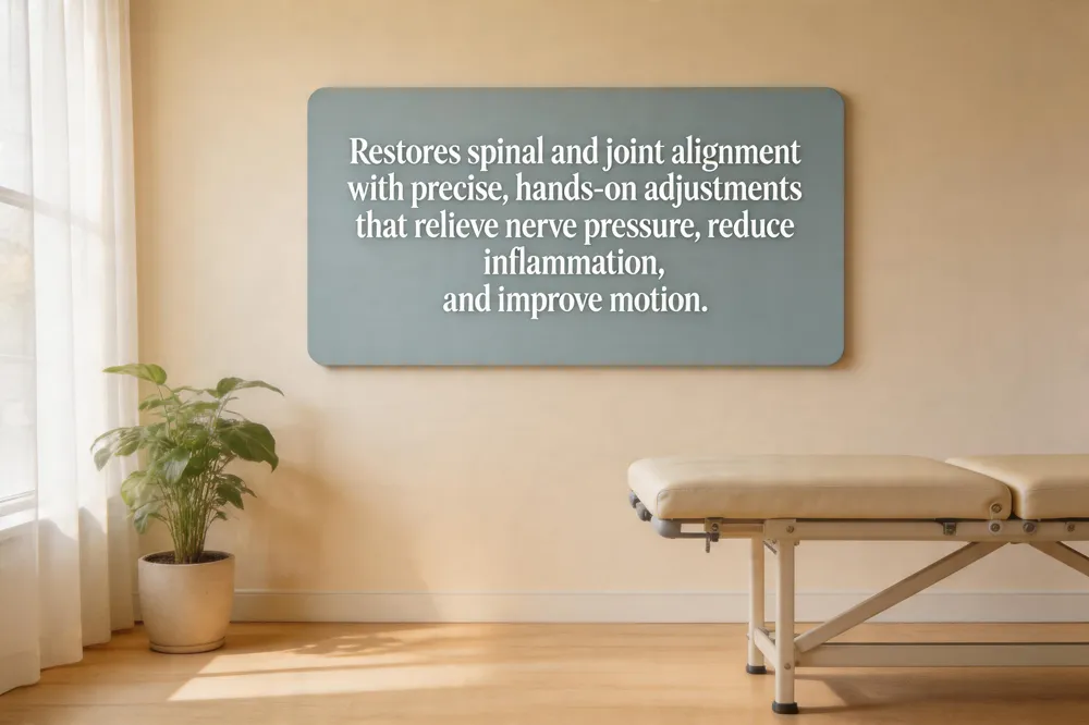Chiropractic care restores proper spinal and joint alignment through precise, hands‑on adjustments that relieve nerve pressure, reduce inflammation, and improve motion. Practitioners correct subluxations—small misalignments—to support the body’s innate healing without drugs or surgery. Treatments are personalized and often combined with spinal decompression, myofascial release, cold‑laser therapy, and corrective exercises, addressing back/neck pain, sciatica, headaches, sports injuries, and pregnancy discomfort.