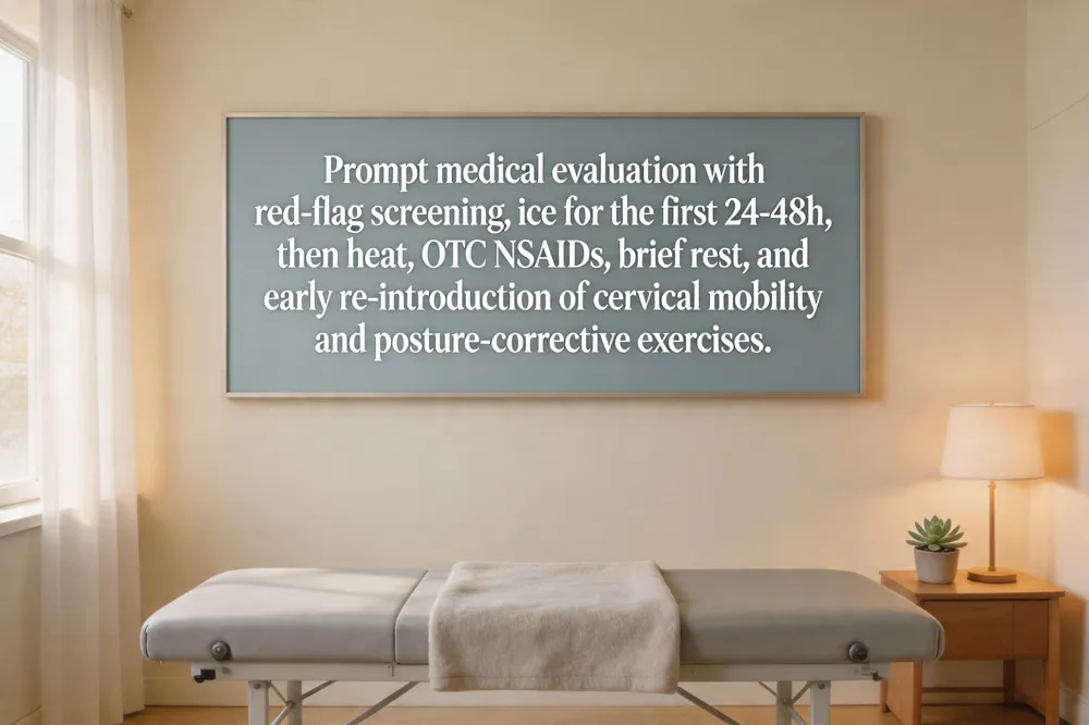 For symptom control, apply ice packs for 15 minutes every 2–3 hours during the first 24–48 hours to limit swelling, then transition to moist heat or a warm shower to relax muscles. Over‑the‑counter NSAIDs such as ibuprofen or acetaminophen can be taken as directed for pain relief. Brief rest (24–48 hours) is advised, followed by activity modification: avoid heavy lifting, high‑impact sports, and prolonged static positions while encouraging walks and neck movements.