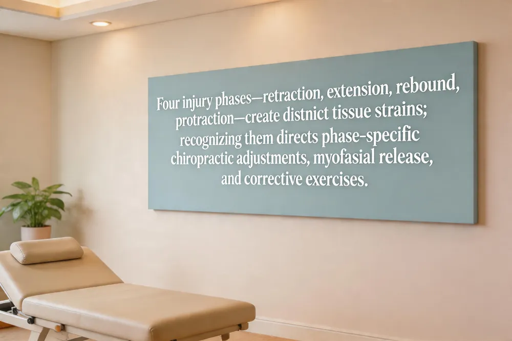 The biomechanical sequence of a whiplash injury consists of four distinct phases: an abrupt retraction (rapid head‑to‑body separation), a swift extension (head‑to‑body under‑traction), a rebound or oscillation where the head moves back toward the torso, and a final protraction (return to neutral or forward positioning). Each phase creates a different pattern of tissue strain—retraction stresses the posterior neck structures, extension loads the anterior soft tissues, rebound produces shear forces across the facet joints, and protraction stretches the cervical ligaments. Recognizing these strain patterns guides treatment: chiropractic adjustments can realign the vertebrae that were overloaded, myofascial release reduces muscle tension in the posterior and anterior chains, and corrective exercises such as chin tucks, neck rotations, and scapular stabilization restore balanced strength and motion. Early, phase‑specific care—heat or ice to modulate inflammation, gentle range‑of‑motion exercises after a warm‑up, and ergonomic education—accelerates recovery, prevents scar tissue formation, and lowers the risk of chronic neck pain.
