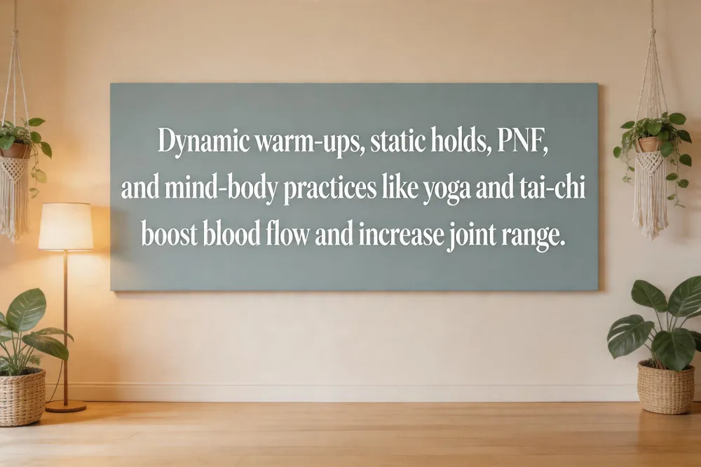 A well‑rounded flexibility program blends dynamic warm‑up movements (leg swings, arm circles, torso twists) that raise blood flow and synovial fluid before activity, with static holds of 15‑30 seconds after exercise to lengthen muscle fibers and cement long‑term gains. Proprioceptive Neuromuscular Facilitation (PNF) combos—passive stretch followed by a brief isometric contraction—additionally unlock joint capsule elasticity. Mind‑body practices such as yoga, tai‑chi, and low‑impact aquatic drills provide smooth, controlled full‑range motions that reinforce joint stability while minimizing load.
