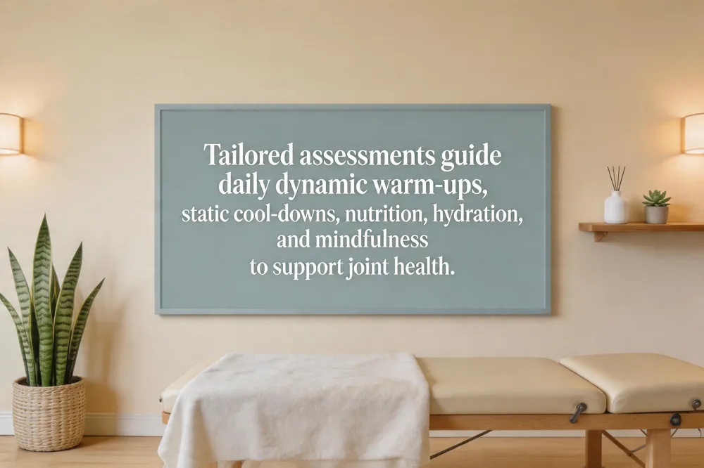 A comprehensive patient assessment and clear goal setting are the foundation of any successful flexibility program. Chiropractors evaluate joint range, posture, movement history, and pain patterns before designing a daily schedule that blends a dynamic warm‑up (e.g., leg swings, arm circles) with a static cool‑down (15‑30 seconds per stretch) to prime synovial fluid and maintain long‑term mobility. Nutrition supports tissue health; omega‑3 fatty acids, vitamin D, and collagen‑rich foods reduce inflammation and promote cartilage resilience. Adequate hydration is essential for synovial fluid production, which lubricates joints and enhances glide during movement. Mind‑body practices such as yoga, tai chi, and mindfulness meditation help regulate muscle tone, improve proprioception, and lower stress‑related tension that can limit flexibility.