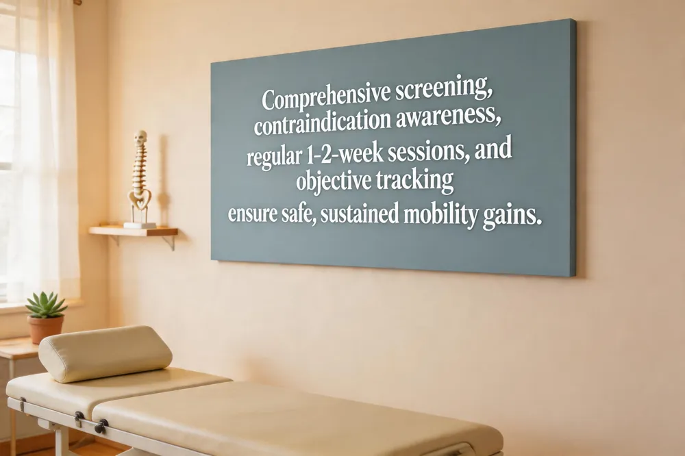 A thorough biomechanical and health screening is the first step before any manual therapy. Chiropractors evaluate joint range, posture, medical history, and red‑flag conditions such as osteoporosis, acute fractures, or severe arthritis. Contraindications include compromised bone integrity, recent trauma, and, in certain cases, pregnancy—where gentle, low‑force techniques or activator methods are preferred. To achieve and maintain optimal joint flexibility, most clinicians schedule manual therapy sessions every 1–2 weeks, allowing tissue adaptation while minimizing soreness. Progress is tracked through objective measurements (e.g., goniometer angles, flexibility tests) and patient‑reported outcomes recorded in apps or journals. Finally, patient education on home mobility routines, ergonomic habits, and safe stretching (dynamic warm‑ups, static cool‑downs, and PNF) empowers individuals to sustain gains between visits and prevent recurrence of stiffness or pain.