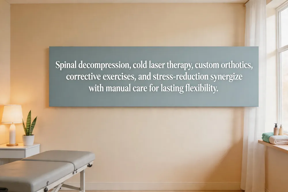 Cold laser therapy (low‑level laser) reduces inflammation and pain, allowing patients to engage more fully in mobility drills and manual stretching.