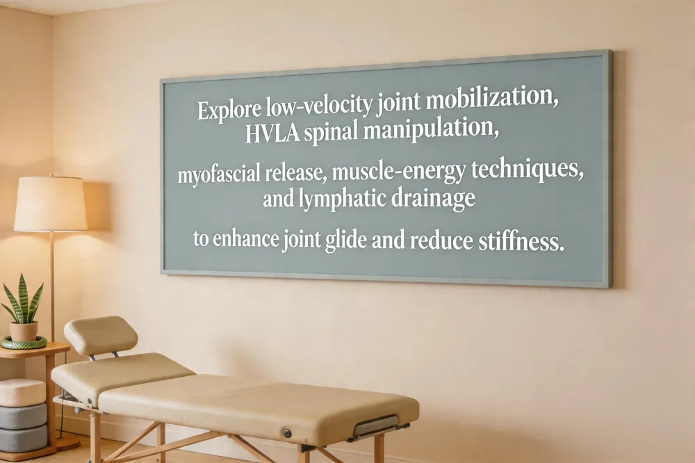 Joint mobilization uses low‑velocity, passive movements that glide joint surfaces, increasing synovial fluid flow and reducing stiffness. [Spinal manipulation (HVLA)] delivers a rapid, controlled thrust that moves a joint beyond its passive range; the resulting cavitation—an audible “pop”—indicates gas release and can immediately improve joint alignment and motion. Myofascial release applies gentle, sustained pressure to fascia, breaking adhesions and restoring tissue elasticity for smoother joint glide. Muscle‑energy techniques engage the patient’s own isometric contractions against a counter‑force, relaxing tight muscles and addressing neural tissue tension that may limit mobility. Lymphatic drainage, a soft‑tissue modality, gently massages superficial lymph nodes to promote fluid movement, decrease swelling, and support tissue healing.