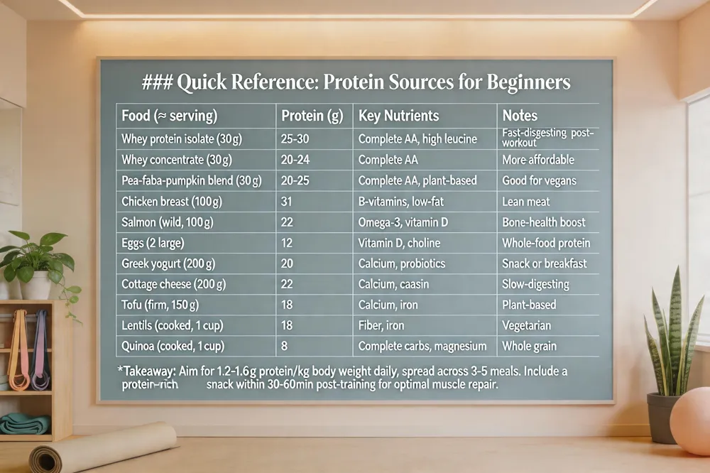 Beginners aiming to add muscle should prioritize high‑quality protein that supplies all essential amino acids. Fast‑digesting whey protein isolate is often the most effective supplement because it delivers a complete amino‑acid profile, especially leucine, which triggers muscle‑protein synthesis. Affordable whey concentrates also work well for those new to supplementation. For vegans or individuals with dairy sensitivities, plant‑based blends—such as pea, faba bean and pumpkin seed isolates—provide a complete profile and are a solid alternative. Whole‑food sources remain essential: lean meats (chicken, turkey, salmon), eggs, Greek yogurt, cottage cheese, tofu, tempeh, lentils, and quinoa each supply 20–30 g of protein per serving and support both muscle repair and bone health. Protein intake should be spread across meals, targeting roughly 1.2–1.6 g per kilogram of body weight (or 0.8–1.0 g per pound) per day. Consuming a protein‑rich snack or shake within 30–60 minutes after resistance training maximizes recovery and muscle growth.