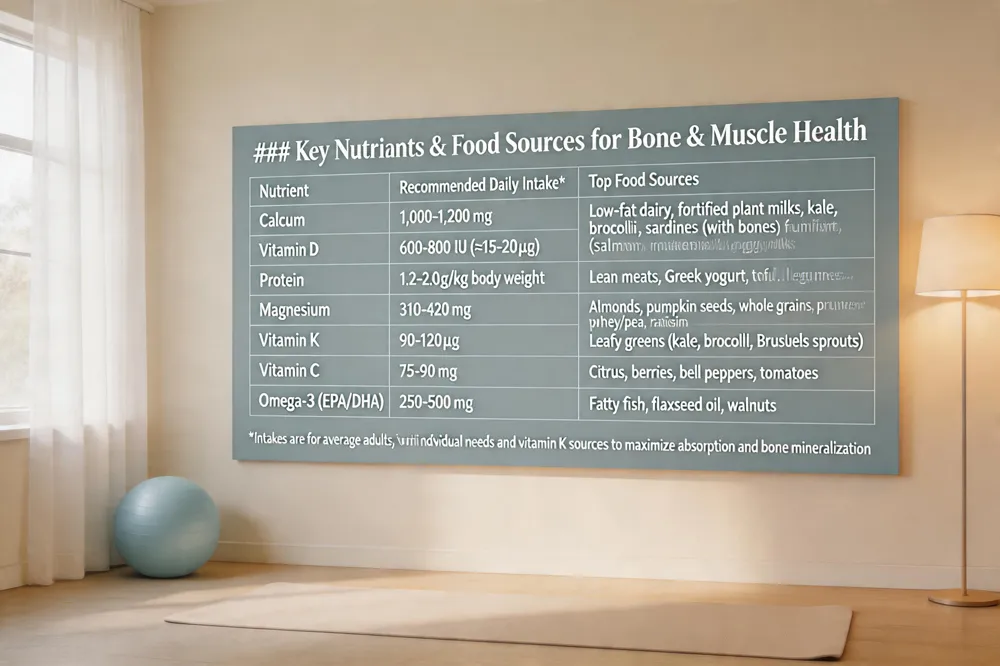 Strong bones and muscles need calcium, Vitamin D, and protein. Include dairy or fortified plant milks, leafy greens like kale and broccoli, and calcium‑rich fish with bones (sardines, salmon) to meet calcium needs. Vitamin D comes from sunlight, fortified foods, or oily fish. Protein—lean meats, soaked beans, tofu, Greek yogurt—supports repair and bone density. Add magnesium‑rich nuts, seeds, dried fruits (prunes, raisins) and vitamin C‑rich produce for collagen.